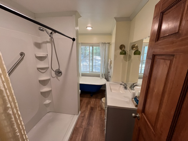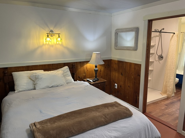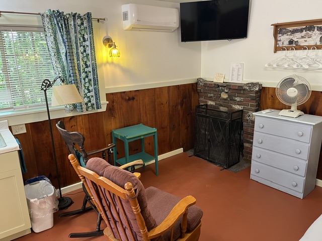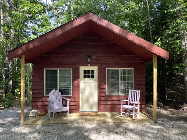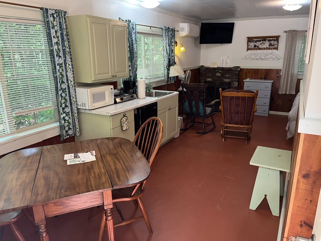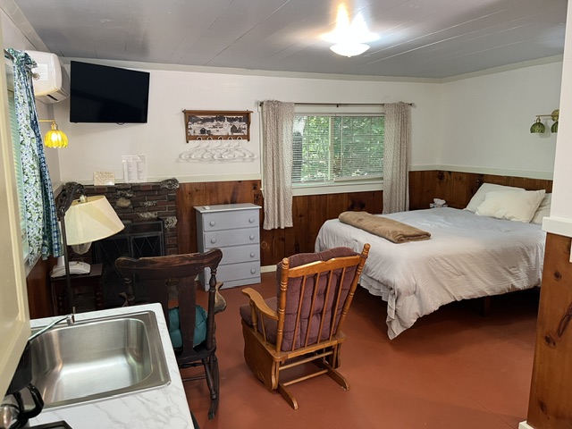 The one and only “One Maine Pine” cabin! One bedroom (queen bed with adjustable base) with a warm fireplace, a large shower and Clawfoot tub, Kitchenette, dining area, heat pump (heat or AC), DirectTV. and Wifi.